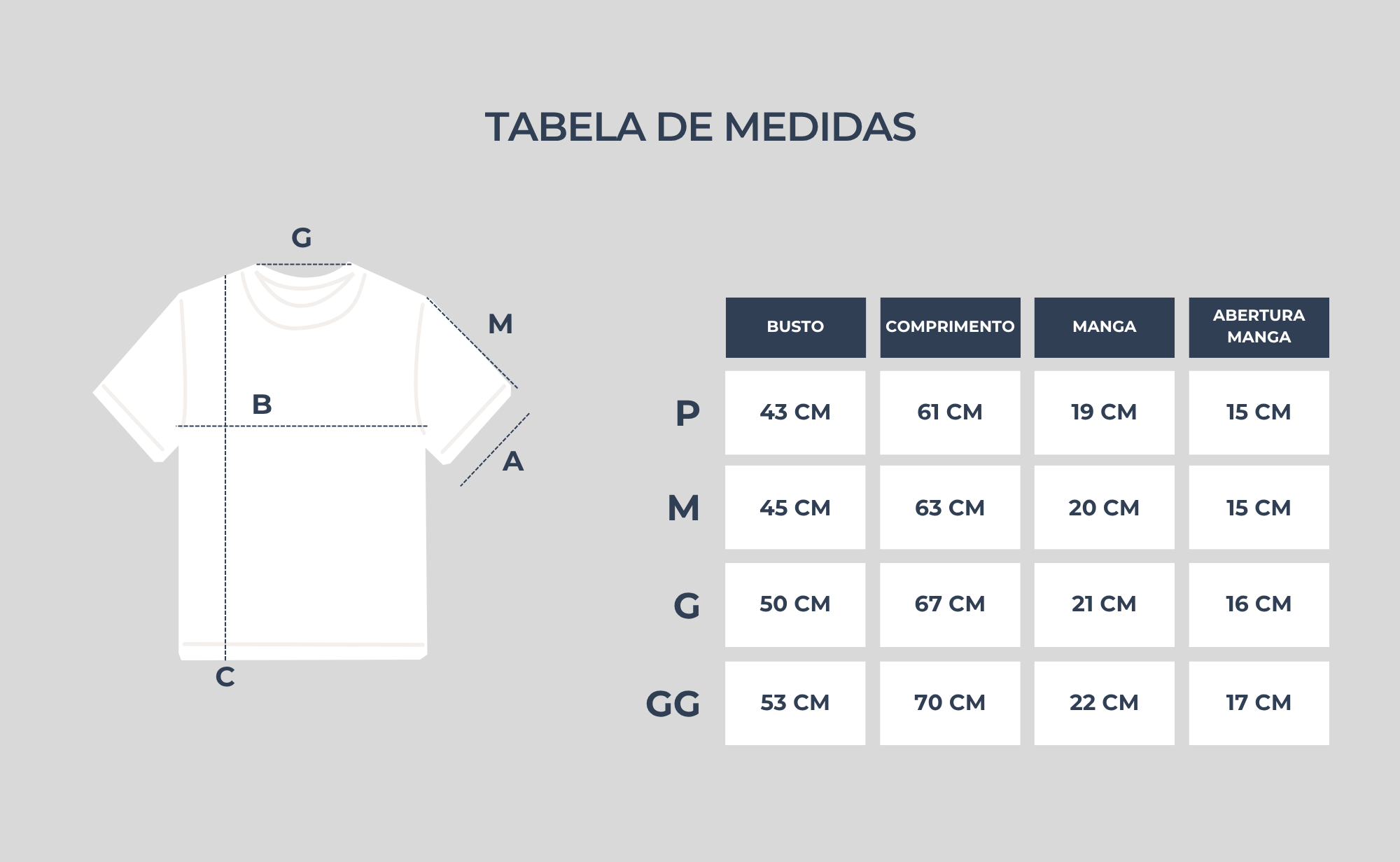 Confira abaixo as medidas da peça e encontre a sua: