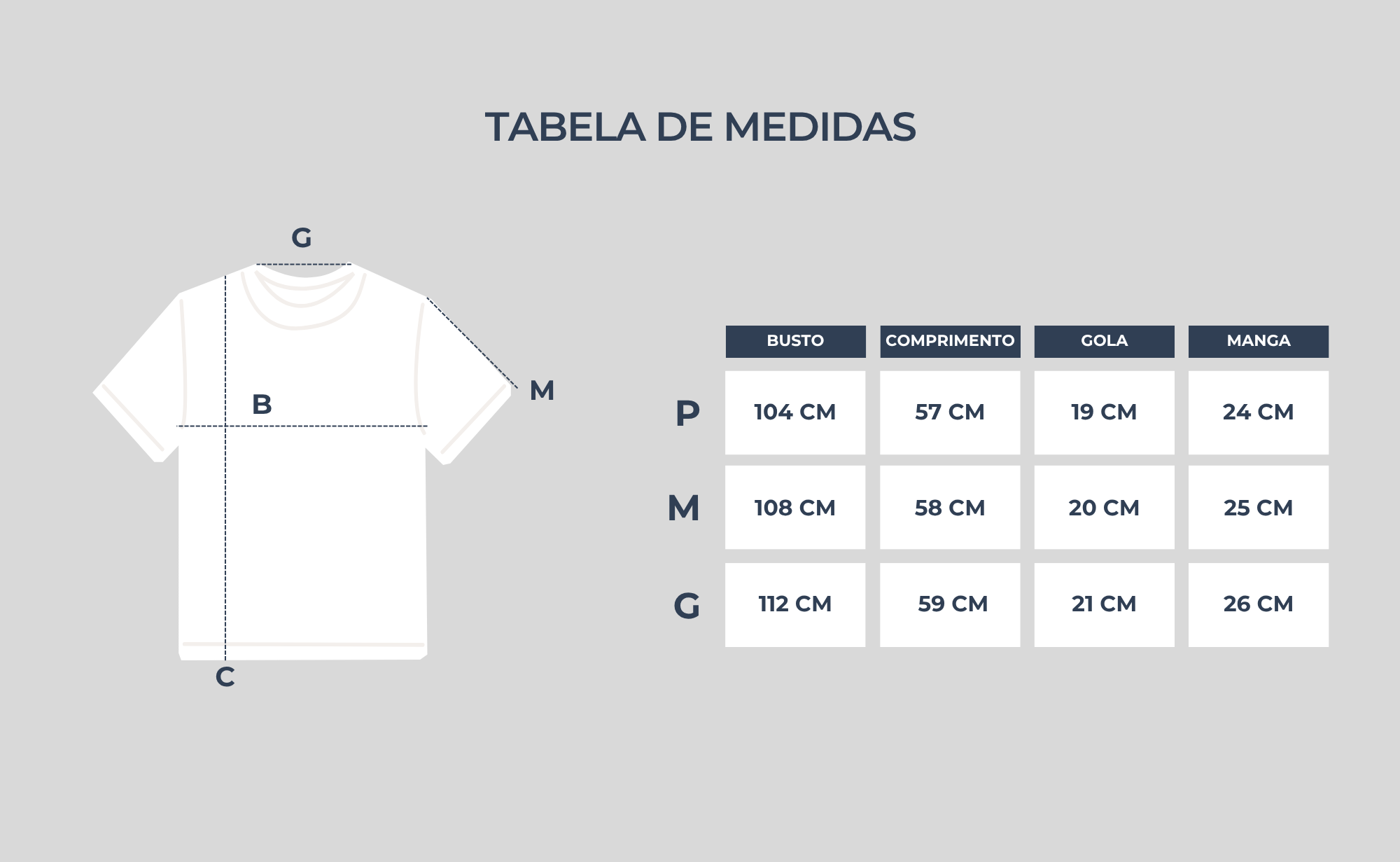Confira abaixo as medidas da peça e escolha a que ficará perfeita em você: